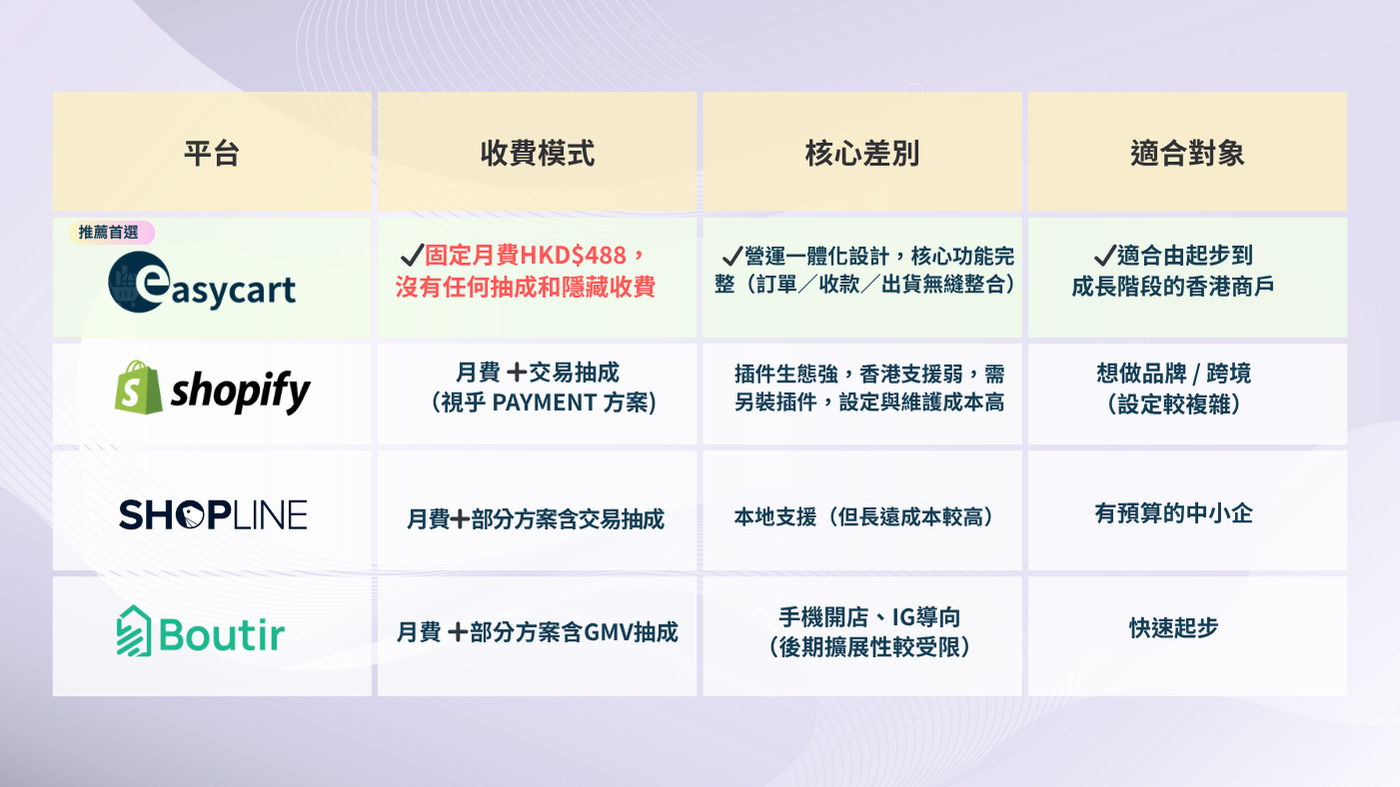 市面上常見選擇包括Shopify、Shopline、Boutir,以及近年開始被討論嘅 EasyCart。