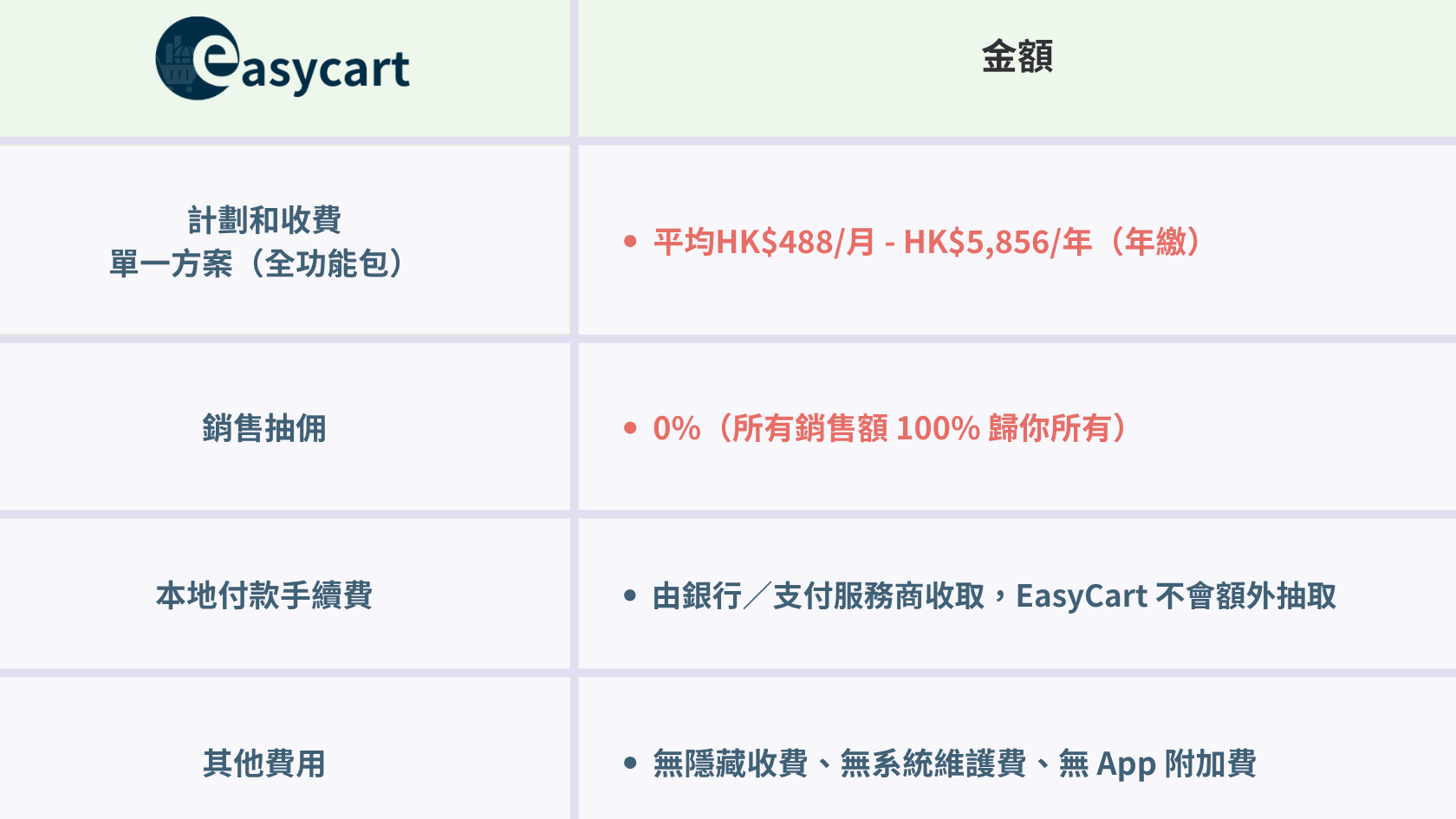 EasyCart 嘅定價特色:單一方案全部功能包: