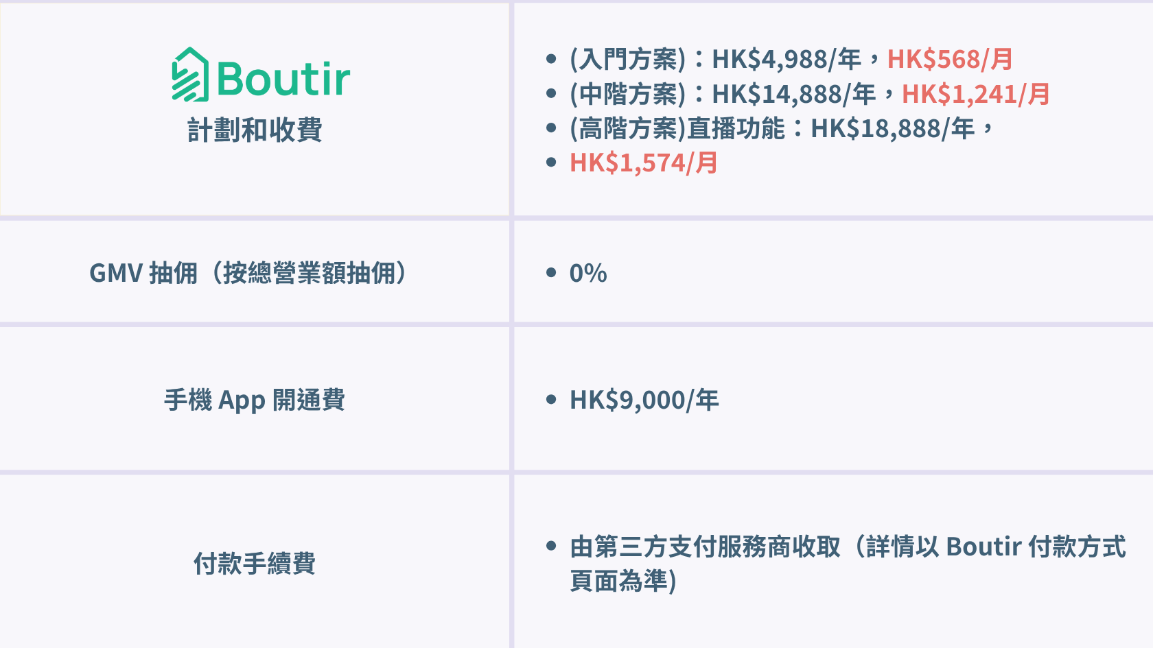 資料來源:Boutir 官方定價頁